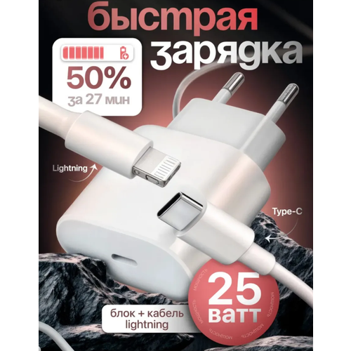 Быстрое сетевое зарядное устройство 25 W для IPhone, iPad, AirPods с кабелем Type C-Lightning/Белый