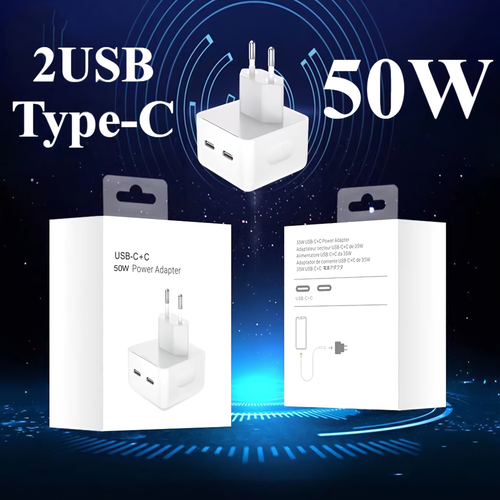 Адаптер питания 50W / 2 разъема Type-C / Быстрая зарядка для iPhone, iPad, AirPods