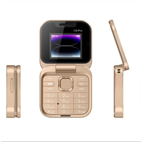 Мини-телефон i16Pro, с камерой, кнопочный, раскладушка, золотой