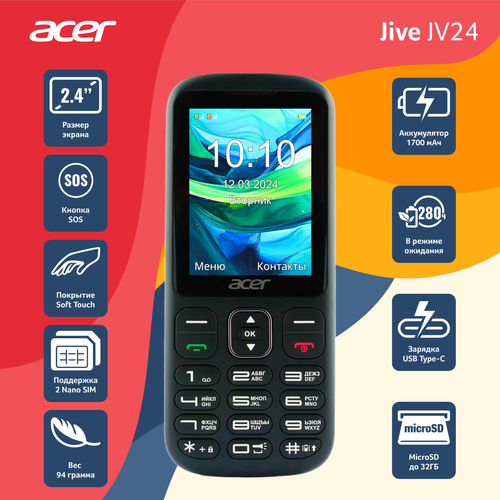 Телефон сотовый Acer Jive JV24, 2 Nano-SIM, 2.4", 1700 мАч, Черный