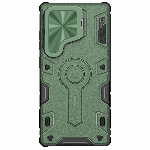 Противоударный чехол зеленого цвета от Nillkin на Samsung Galaxy S25 Ultra с откидной металлической крышкой для камеры, серия CamShield Armor Prop Case