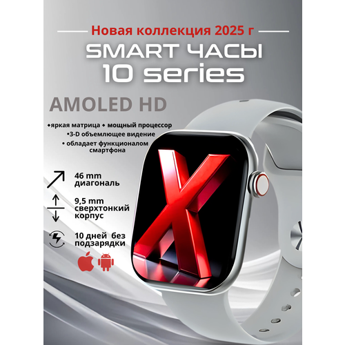 Смарт часы X10 мужские, умные, AMOLED, 46 мм, десятая серия, премиум, серебряный