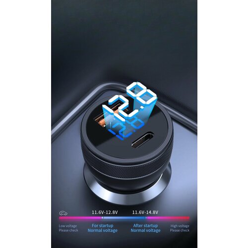 Зарядное устройство, автомобильное, два порта, USB Type A и C, 55 W, дисплей, черное