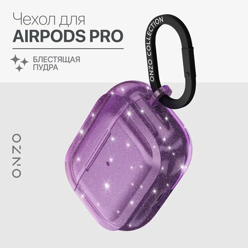 Кейс для беспроводных наушников Airpods Pro / Чехол на Аирподс про с карабином, сиреневый прозрачный блестящий