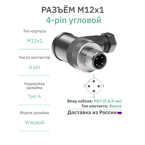 Разъём М12 4 pin угловой / вилка (папа) / PG7 (3-6,5 мм диаметр под кабель) / модель RAZM-M12-C4A