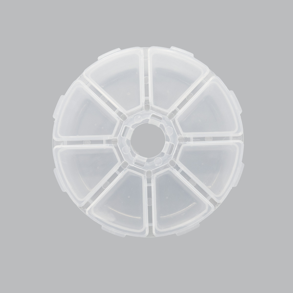прозрачныйКруглый контейнер из прозрачного пластика с крышкой и 8 секциями.