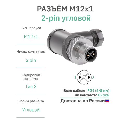 Разъём M12 S-coding 2 pin угловой / вилка (папа) / PG9 (4-8 мм диаметр под кабель) / модель RAZM-M12-C2A-CODE-S-PG9