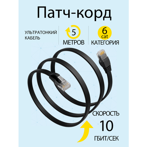 Патч корд 5м категория 6 rj45, плоский, сетевой интернет кабель