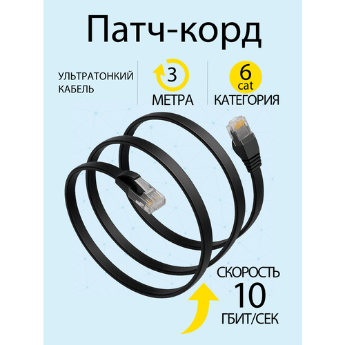 Патч корд 3 метра категория 6 rj45, плоский, сетевой интернет кабель
