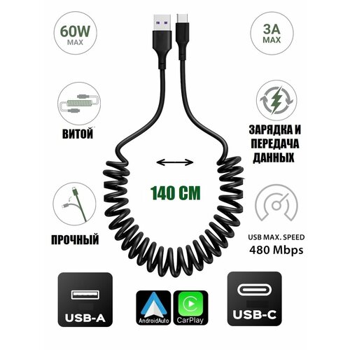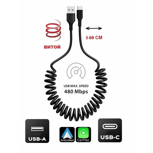 Кабель витой USB-A - USB-C 1.4 м 60 Вт 3A для Car Play и Android Auto