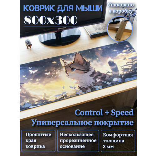 Коврик для мыши 800х300х3. Котик смотрит на бабочек