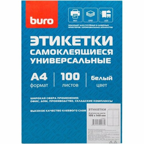 Этикетки BURO A4 105x148мм 4шт на листе/100л./белый матовое самоклей. универсальная