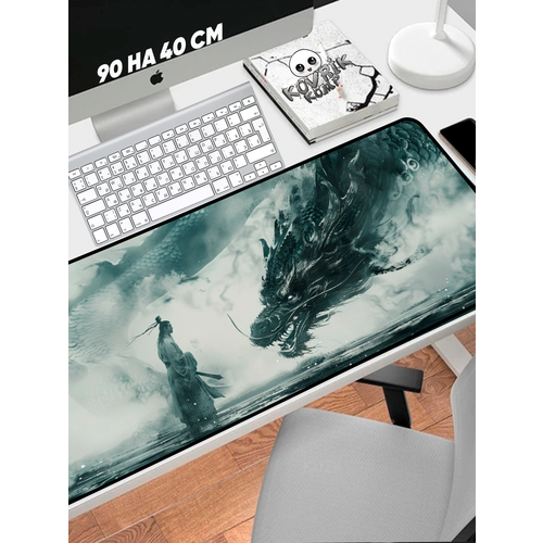 Большой игровой коврик для мышки с принтом, 90х40 см, Дракон и самурай. Компьютерный ковер под клавиатуру и мышь на весь стол