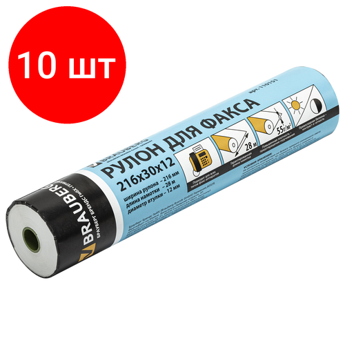Комплект 10 шт, Рулон для факса, 216 мм (диаметр 45 мм, длина 28 м, втулка 12 мм), BRAUBERG, 110151