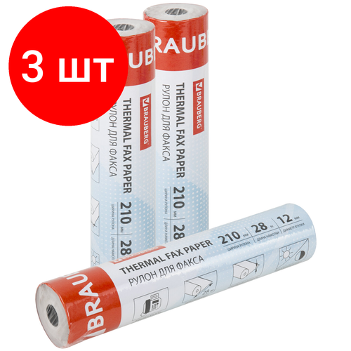 Комплект 3 шт, Рулон для факса 210 мм (диаметр 45 мм, длина 28 м, втулка 12 мм), BRAUBERG, 110149