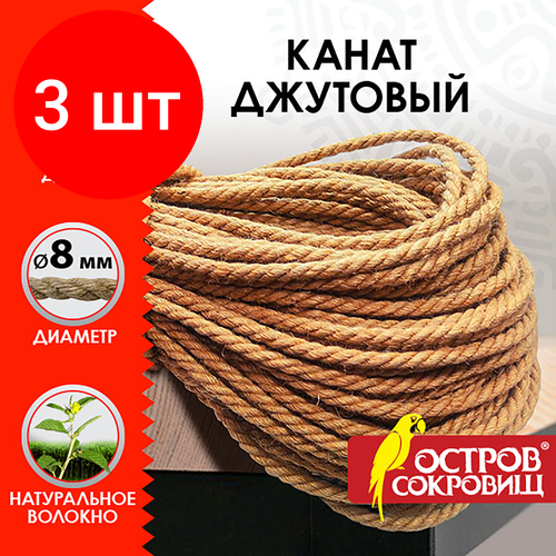 Комплект 3 шт, Веревка (канат) джутовая для рукоделия, декоративная, длина 24 м, d=8 мм, остров сокровищ, 607949