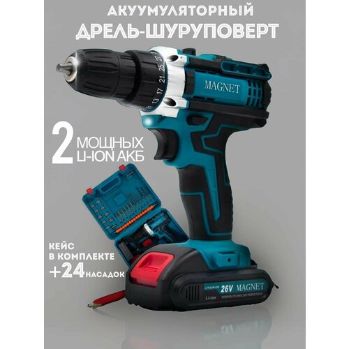 Дрель-шуруповерт MAGNET , аккумуляторный 15-18 В, 32 Нм, 2 АКБ , с набором инструментов 28 предметов /шуруповерт полупрофессиональный в кейсе синий