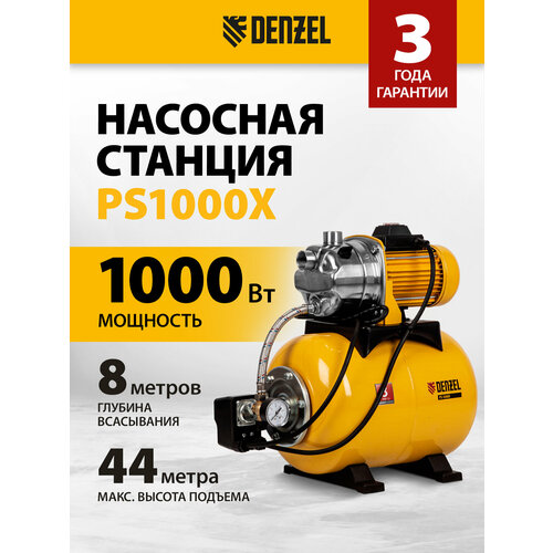 Насосная станция PS1000Х, 1000 Вт, 3500 л/ч, ресивер 24 л, подъем 44 м, нержавейка Denzel 100051831122
