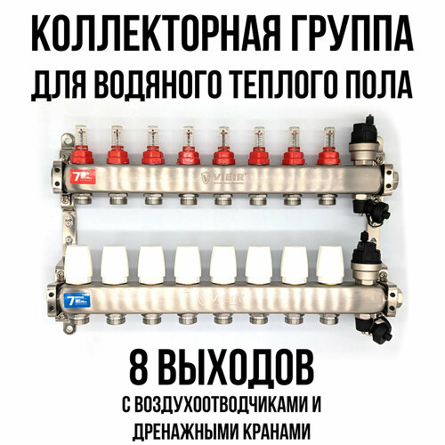 Коллектор для теплого пола на 8 выходов с расходомерами, автоматическими воздухоотводчиками и дренажными кранами VIEIR