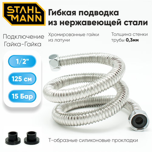 Гибкая подводка для воды 1/2" 125см из нержавеющей стали