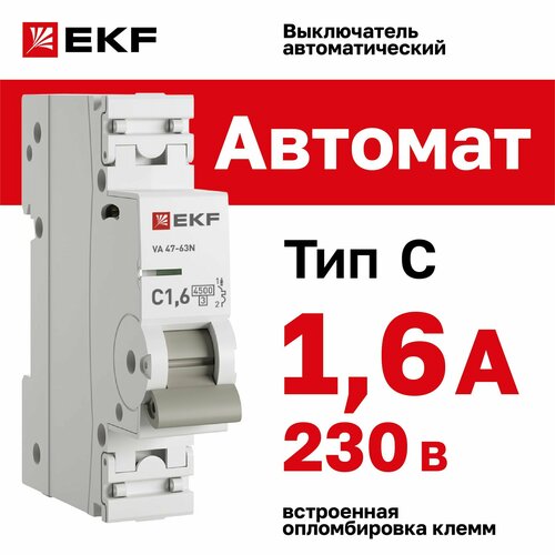 Автомат 1,6А, тип C, однополюсный 1P, 4,5kA, cо встроенной опломбировкой клемм EKF PROXIMA ВА 47-63N (Автоматический выключатель C1,6)