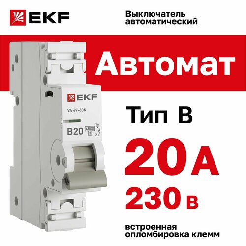 Автомат 20А, тип B, однополюсный 1P, 4,5kA, cо встроенной опломбировкой клемм EKF PROXIMA ВА 47-63N (Автоматический выключатель B20)