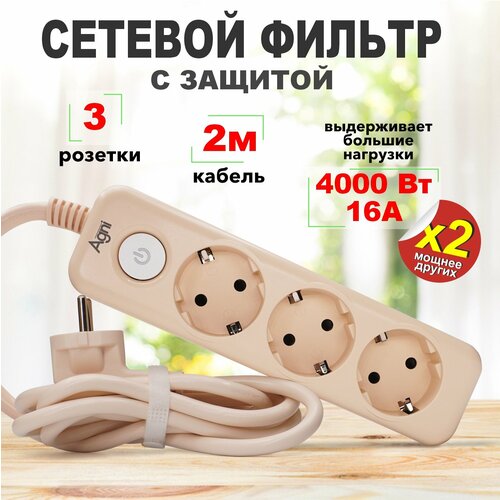 Сетевой фильтр с заземлением на 3 розетки AGNI с выключателем, защитные шторки, 4000 Вт/16 А, удлинитель 2 метра