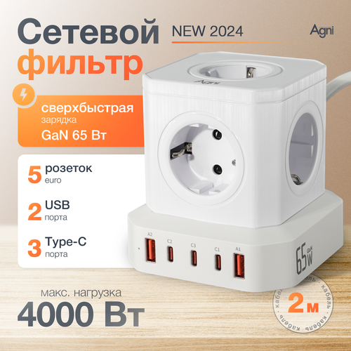 Сетевой фильтр с технологией GAN, AGNI, 5 розетки + 2 USB / 3 TYPE-C быстрая зарядка 65 W, кабель 2м