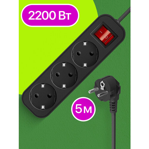 Сетевой фильтр Гарнизон черный 3 розетки с заземлением 16А 10м