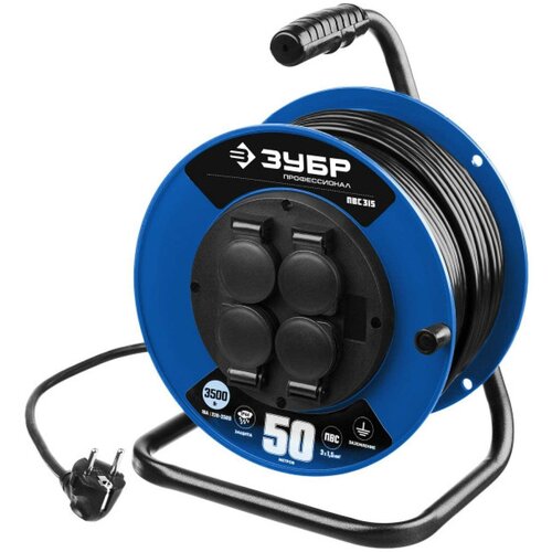 Удлинитель на катушке ЗУБР 55080-50, 4 розетки, с/з, 16А / 3700 Вт черный 50 м 23 мм 30 мм 38 мм 1.5 м² 4