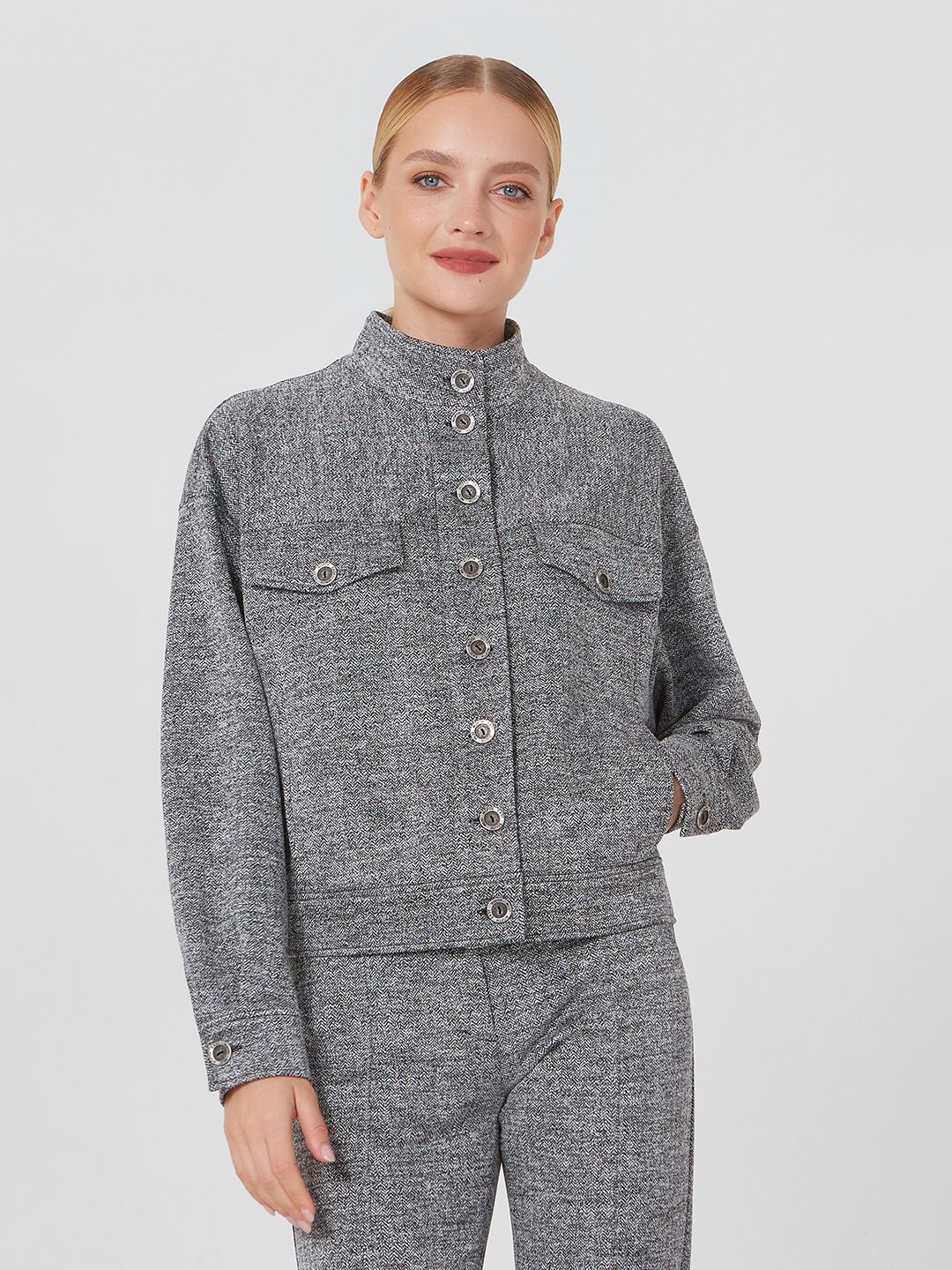 серыйЖакет приталенного силуэта , длиной выше бедер .