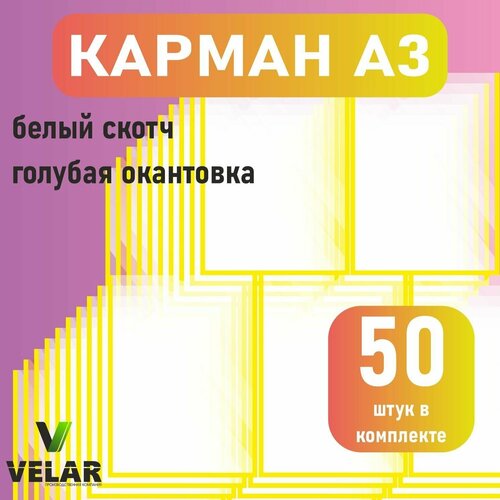 Карман для стенда А3 (297х420 мм) со скотчем, желтый кант, плоский настенный, прозрачный, ПЭТ 0,3 мм, 50 шт, Velar