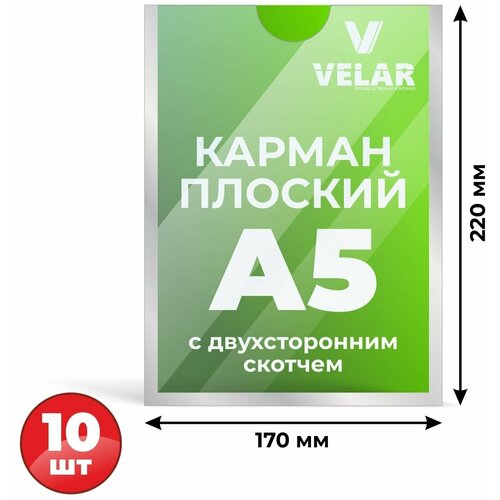 Карман для стенда А5 (148х210 мм) со скотчем, серебряный кант, плоский настенный, прозрачный, ПЭТ 0,3 мм, 10 шт, Velar