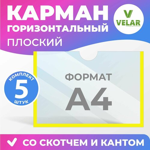 Карман информационный Velar для стенда А4 (297х210 мм) со скотчем, желтый кант, плоский настенный, прозрачный, горизонтальный, ПЭТ 0,3 мм, 5 шт