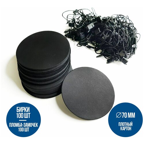 Бирки из черного картона, круг диаметр 7 см, с черным текстильным подвесом - 100 шт.