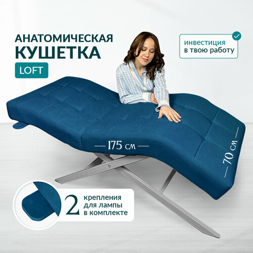 Анатомическая кушетка в стиле Лофт, в салон красоты, серебристая ножка, в студию, для наращивания ресниц, для преманентного макияжа, Велюр Цвет Синий