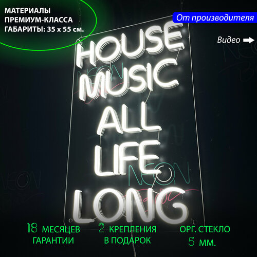 Неоновый светильник / Неоновая светодиодная вывеска на стену / Настенная неоновая лампа, надпись "House music all life long", для ночных клубов, баров или лаунж-зон, 35 х 55 см.