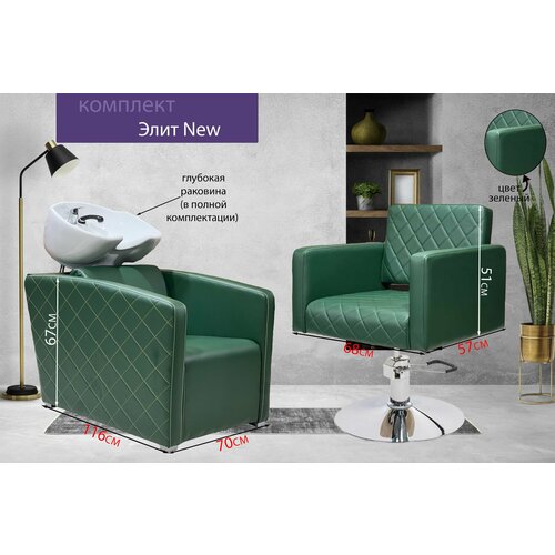 Парикмахерский комплект "Элит New", Зеленый, 1 кресло гидравлика диск, 1 мойка глубокая белая раковина