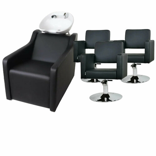 Парикмахерский комплект "Groan", Черный, 3 кресла гидравлика диск, 1 мойка глубокая белая раковина
