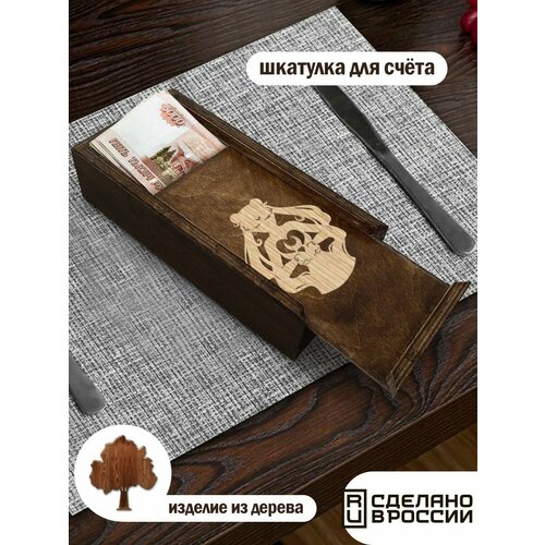 коричневыйСчетница для вашего ресторана бара или кафе. Стильная и долговечная, рисунок нанесен гравировкой по дереву, такой чек бук не помнется и не порвется. Деревянная расчетница с переплетом и карманом из натуральной кожи. Размер счетницы 200х95х49мм.
