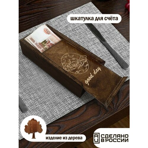 коричневыйСчетница для вашего ресторана бара или кафе. Стильная и долговечная, рисунок нанесен гравировкой по дереву, такой чек бук не помнется и не порвется. Деревянная расчетница с переплетом и карманом из натуральной кожи. Размер счетницы 200х95х49мм.