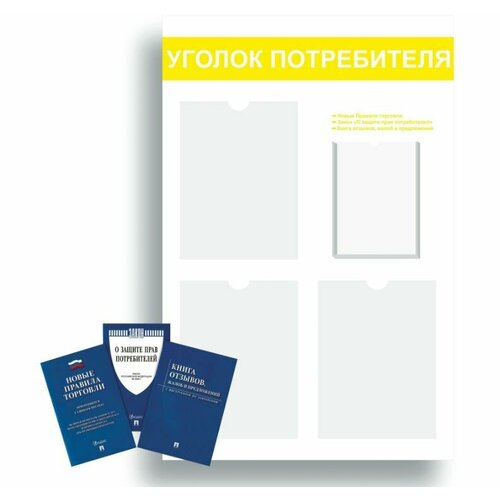 Уголок потребителя, покупателя 545*835 мм с 3 плоскими карманами A4 и 1 объемным карманом А5 + комплект книг (3 шт.)
