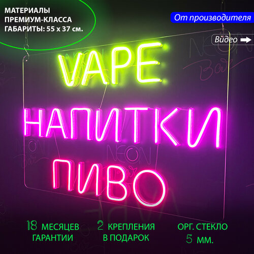 Неоновый светильник / Неоновая светодиодная вывеска на стену / Настенная неоновая лампа, надпись "Vape Напитки Пиво", для табачного магазина, 55 х 37 см.