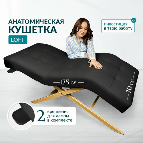 Анатомическая кушетка в стиле Лофт, в салон красоты, в студию, для наращивания ресниц, для преманентного макияжа, кожа Цвет Черный на золотых ножках