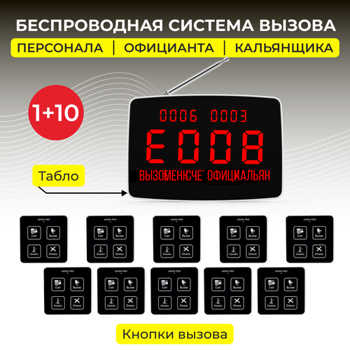 Табло отображения вызова и оповещения персонала - 1 шт, сенсорная кнопка вызова персонала, кальянщика - 10 шт. Радиус 50-60 м.