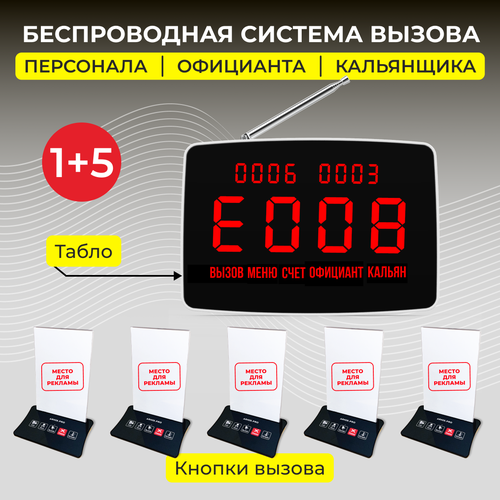 Табло отображения вызова и оповещения персонала - 1 шт, сенсорная кнопка вызова официанта, персонала, кальянщика - 5 шт. Радиус 50-60 м.