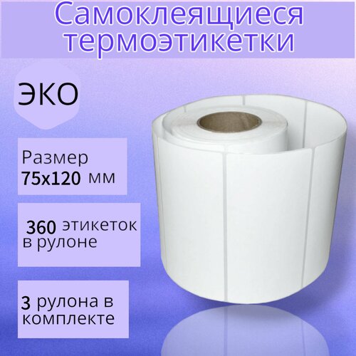 Термоэтикетки ЭКО самоклеющиеся 75х120 (300 шт в ролике) втулка 40 мм упаковка 3 ролика
