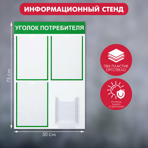 Информационный стенд «Уголок потребителя» 4 кармана (3 плоских А4, 1 объёмный А5), цвет зелёный