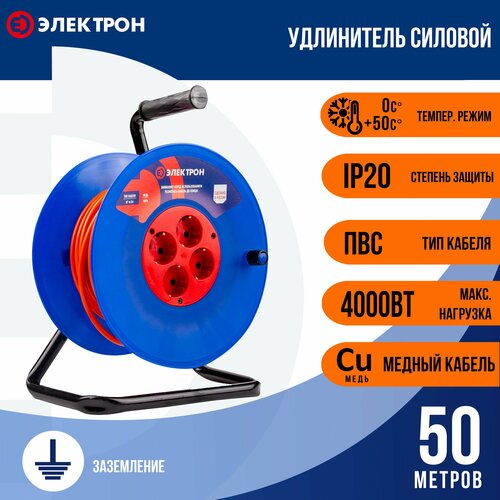 Удлинитель силовой 50 м ПВС 2х1,5 (б/з) 4 розетки 3500 Вт Электрон на катушке