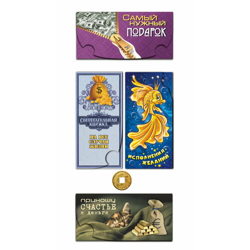 Набор поздравительных конвертов для денег 8,2 х 17см (4 шт) + монета "Денежный талисман"